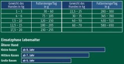 Kalorienbedarf älterer, meist weniger aktiver Hunde. Ein erhöhter Rohfasergehalt stimuliert die Darmtätigkeit und