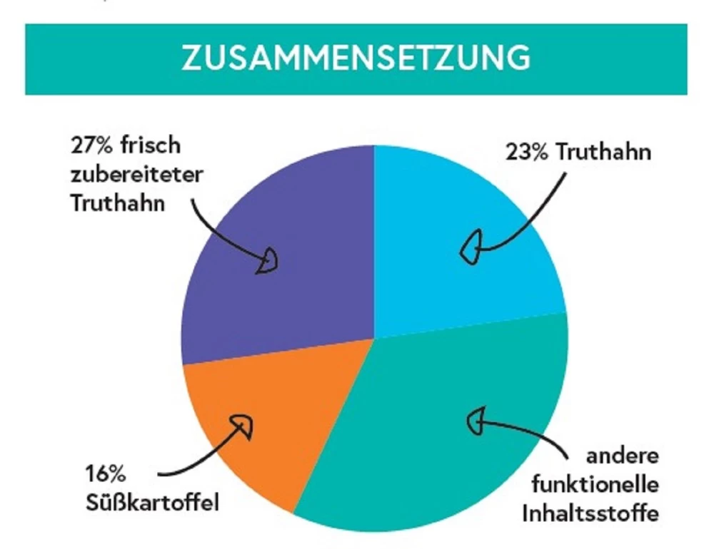 Truthahn 50% (enthält frisch zubereiteten Truthahn 27%, getrockneter Truthahn 21% und Truthahnbrühe 2%), Süßkartoffel (16%), Kartoffel, Erbsen (8%), Rübenschnitzel (entzuckert), Leinsamen, Fischöl, Mineralien, Gemüsebrühe, Preiselbeere (0,2%), Glucosamin (170 mg/kg), Methylsulfonylmethan (170 mg/kg), Chondroitinsulfat (125 mg/kg), Fructooligosaccharide (FOS, 96 mg/kg), Mannanoligosaccharide (MOS, 24 mg/kg)