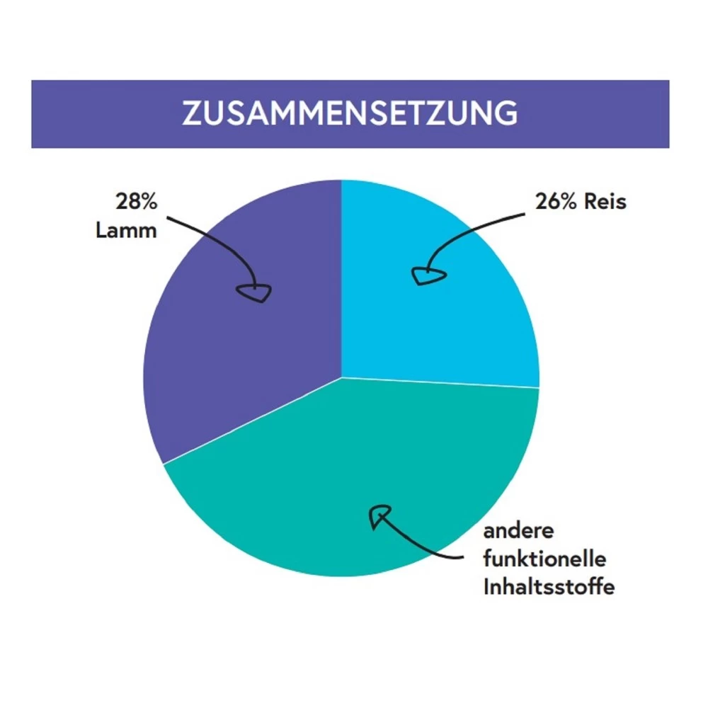 Lamm 28% (enthält getrocknetes Lamm 26% und Lammbrühe 2%), Reis (26%), Gerste, Hafer, Bierhefe, Hühnerfett, Erbsen, Rübenschnitzel (entzuckert) (2%), Mineralien, Yucca-Extrakt (190 mg/kg)