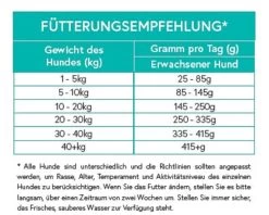 Rohprotein 26,0%; Rohfett 11,0%; Rohfaser 3,0%; Rohasche 8,0%; Feuchtigkeit 8,0%; Stickstofffreie Extraktstoffe 44,0%; Umsetzbare Energie 357 kcal/100g; Omega-6-Fettsäuren 2,0%; Omega-3-Fettsäuren 1,1%; Kalzium 1,5%; Phosphor 1,1%