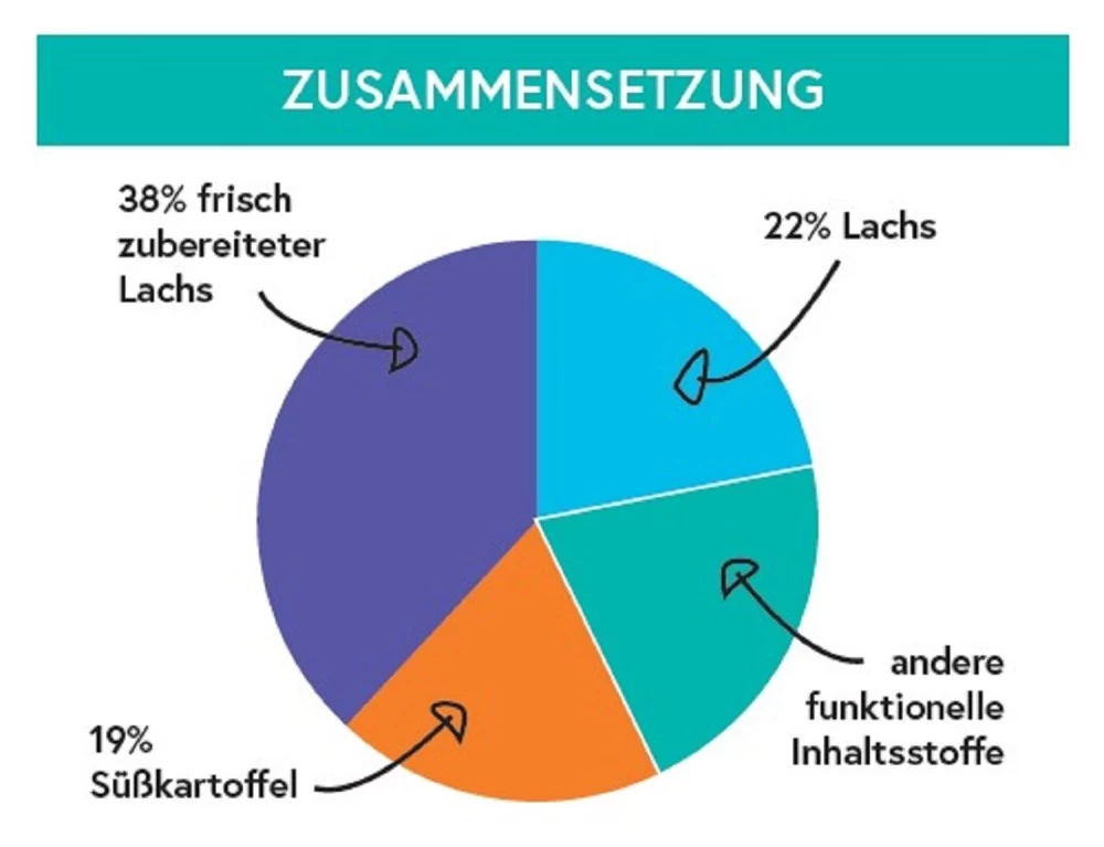 Lachs 60% (enthält frisch zubereiteten Lachs 38%, getrockneten Lachs 20%, Lachsbrühe 2%), Süßkartoffel (19%), Kartoffeln, Rübenschnitzel (entzuckert), Leinsamen, Mineralien, Karotte, Erbsen (0,2%), Fischöl, Gemüsebrühe, Glucosamin (355 mg/ kg), Methylsulfonylmethan (355 mg/kg), Chondroitinsulfat (250 mg/kg), Nukleotide, Fructooligosaccharide (FOS, 96 mg/kg), Mannanoligosaccharide (MOS, 24 mg/kg)