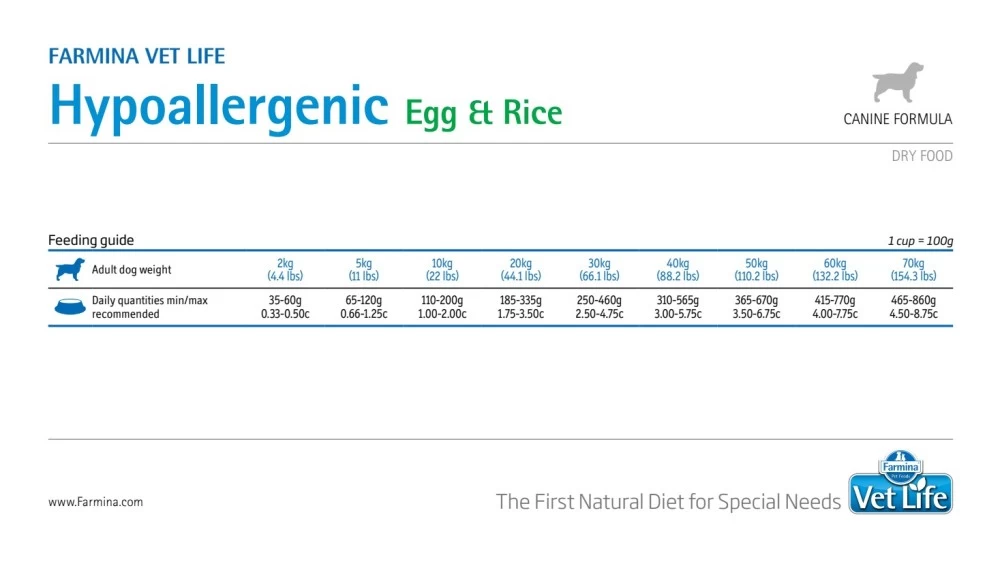 Bei Futtermittelallergien und -intoleranzen. Farmina Vet Life Hypoallergenic Egg & Rice (Ei & Reis) ist ein diätetisches Futtermittel für ausgewachsene Hunde, um Futtermittelallergien und Futtermittelintoleranzen zu reduzieren.