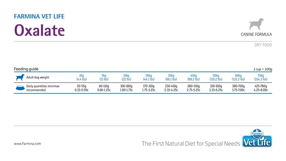 Farmina Vet Life Oxalate ist ein diätetisches Futtermittel für ausgewachsene Hunde, um Urat, Oxalat- und Cystinsteine zu reduzieren. Auch für ausgewachsene Hunde geeignet, die unter schwerer Nierenerkrankung leiden. Reduziert die Bildung von Harnsäure-, Oxalat und Cystin-Steinen und alkalisiert den Urin.