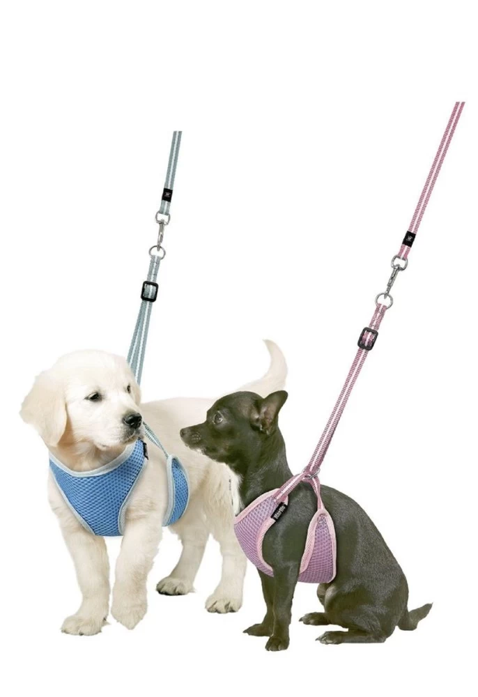 Brustgeschirr fĂĽr Welpen und Mini-Hunderassen, weich gefĂĽttert, Material Nylon, Farbe blau oder pink.