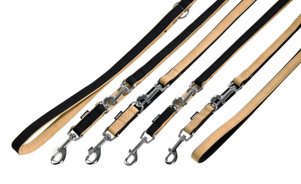 Durch das weiche Material ist die Leine besonders angenehm in der Handhabung. Sie ist erhÀltlich in schwarz-beige oder beige-schwarz und ist mit verchromten BeschlÀgen versehen.