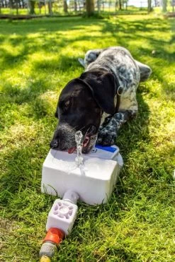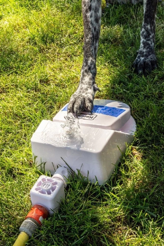 Die Fontäne Splashy ist Spielzeug und Trinkbrunnen in einem. Der Wasserspender aus robustem Kunststoff wird einfach an einen Gartenschlauch angeschlossen und ist schon einsatzbereit. Der aufspritzende Wasserstrahl kann einfach vom Hund selbst betätigt werden, indem er mit der Pfote auf den Auslöser in Form eines Pedals tritt. Schon schießt eine Wasserfontäne nach oben und animiert den Hund zum Spiel mit dem Wasserstrahl und zum Trinken des frischen Wassers. Das Spielzeug ist ein toller Spaß an warmen Tagen und bietet vor allem tierischen Wasserratten lange Beschäftigung.