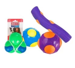 Durasoft KONG, zwei Materialien die für unterschiedliche Texturen und dauerhaften Spielspaß sorgen. Springt völlig unvorhersehbar umher und schwimmt. Ideal für interaktives spielen. Quietscht um den Spieltrieb zu fördern. Farblich sortiert