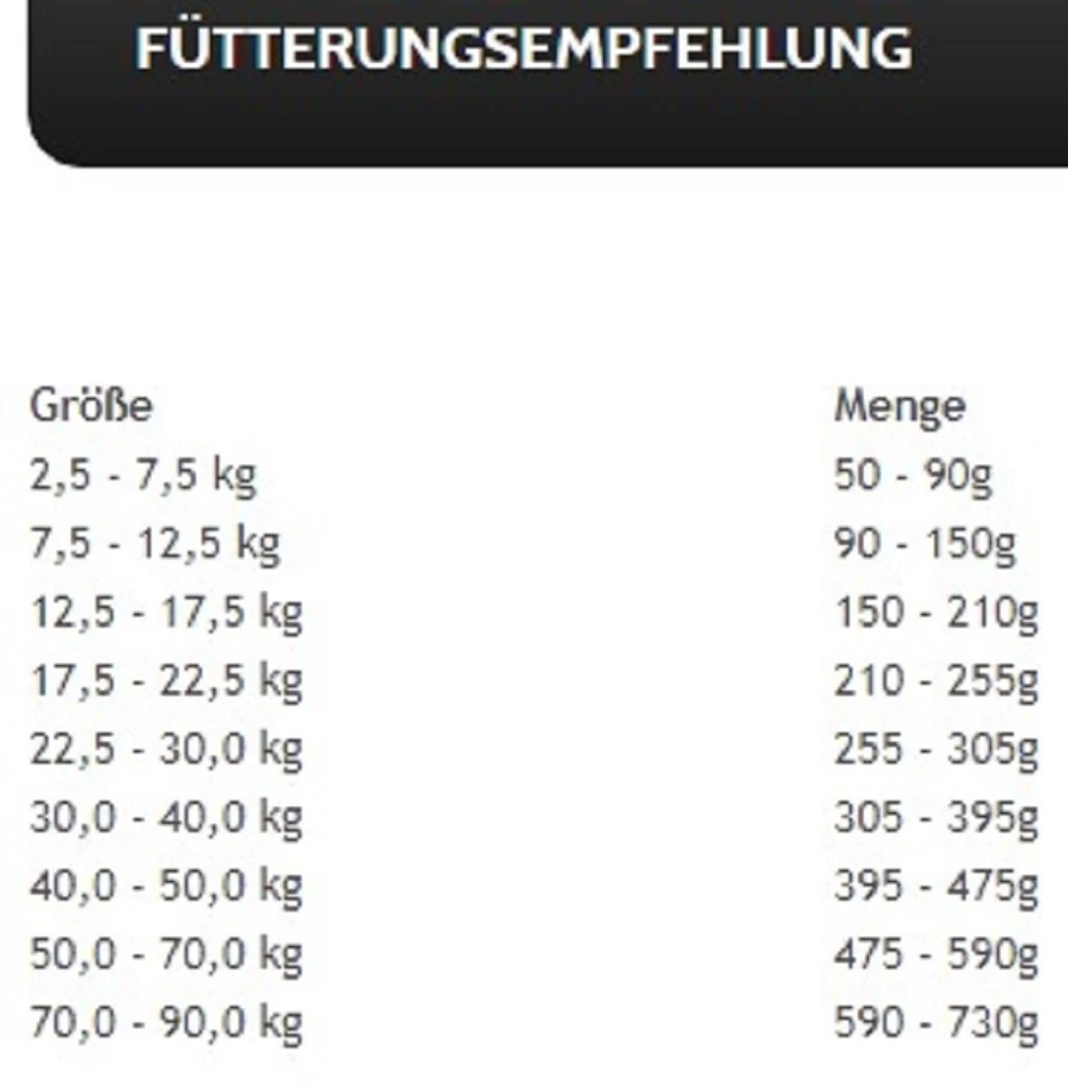 Das Produkt sollte trocken oder mit etwas Wasser gegeben werden. Der Hund sollte immer frisches Wasser zur VerfĂĽgung haben.
