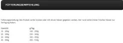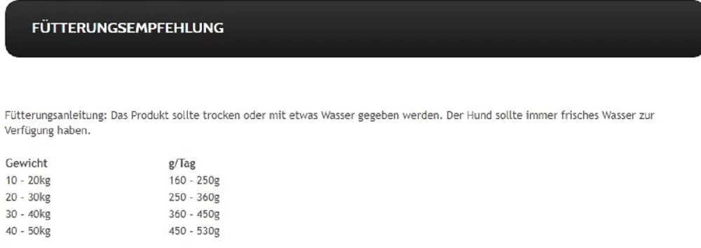 Das Produkt sollte trocken oder mit etwas Wasser gegeben werden. Der Hund sollte immer frisches Wasser zur VerfĂĽgung haben.